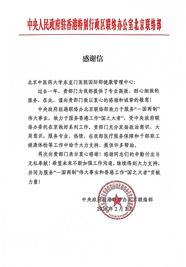 中央政府驻港联络办北京联络部致谢国际部健康管理中心
