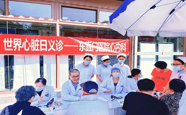 义诊活动设在东直门医院门诊楼前,大量前来就诊的患者来到义诊台前,东直门医院心血管内科的党员、医护们迅速进入状态,包括张立晶主任医师、赵勇主任医师、刘玉庆副主任医师、高群主治医师、潘熠主治医师等。专家们为居民提供专业的医疗服务,普及健康知识和日常保健常识,增强居民健康意识。他们耐心询问病情、仔细检查身体、详细解答疑问,望闻问切、辨证处方,向百姓深入宣传正确的中医思想和内涵,教百姓防病治病、祛病健身的中国传统方法和食疗、药膳之法,宣扬中医健康养生观念;张媛护士长带领郭建芳、马洪霞等护士们测血压、指导生活护理,并给出饮食、锻炼等保健建议……每一个环节都严谨而认真。现场医护人员呼吁:“守护心脏不该等到发病才开始。”一定要养成健康的生活方式,因为不健康生活方式会使心血管疾病风险增加数倍;中医自古强调“起居有常”“食饮有节”,这是非常正确的。日常生活中存在简单易行的中医养护方法:每天按揉小腿肚3分钟,通过激活“第二心脏”促进血液回流,配合太极拳、八段锦等温和运动,实现气血调和。世界心脏联合会倡导通过每日25分钟运动养成健康习惯,与中医“动则生阳”的理念不谋而合……这样的深度义诊,使得居民们围坐或围站在专家周围,聚精会神地聆听着专家们的建议和指导。