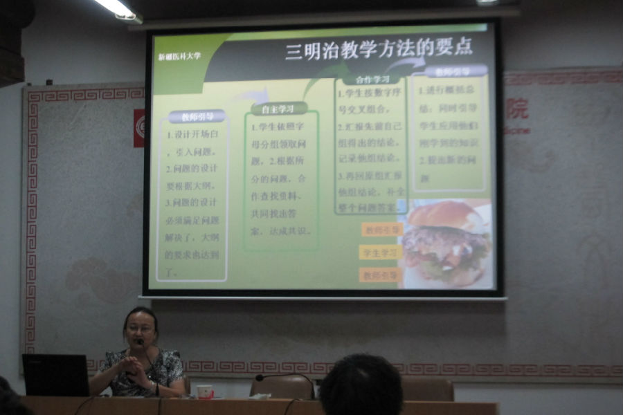 古力沙吾利·塔里普副教授主要介绍了“三明治教学法”的理念与方法,并举了她在新疆医科大学运用该方法对学生进行西医内科学教学,取得良好效果的生动案例,让大家对“三明治教学法”的分组方式、时间安排等实施操作有了更清楚的认识。