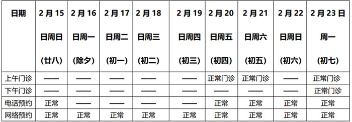 二、儿科、推拿疼痛科、皮肤科、口腔科、乳腺科、男科、中医综合治疗室2月15日、2月20日至2月23日全天门诊;
