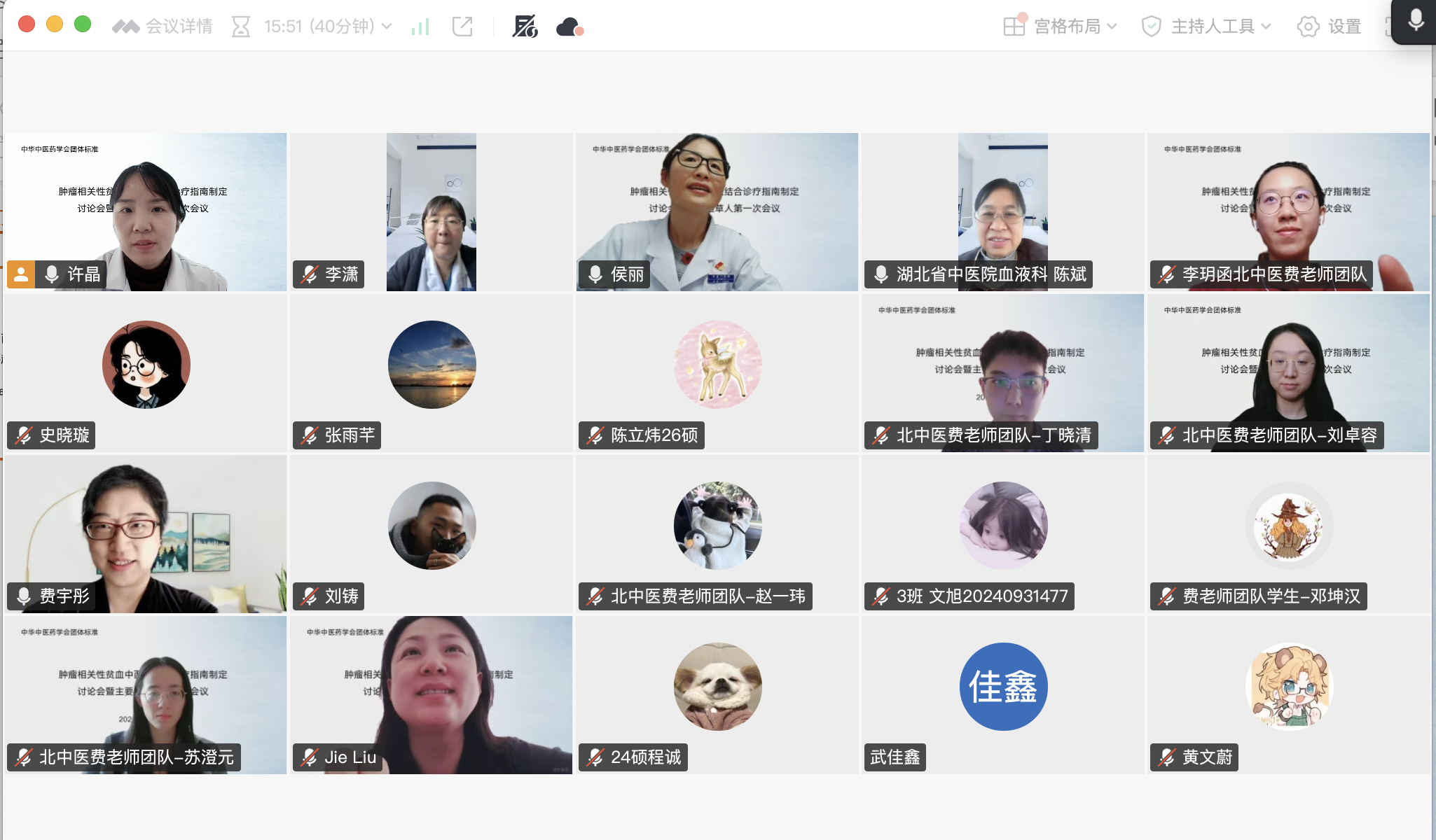 为优化《肿瘤相关性贫血中西医诊疗指南》临床问题清单,2026年2月13日下午14:00线上召开《肿瘤相关性贫血中西医结合诊疗指南》讨论会(腾讯会议号:369521465),指南牵头人北京中医药大学东直门医院血液肿瘤科侯丽教授以及项目组主要成员李潇副主任医师、北京中医药大学费宇彤教授、中国中医科学院广安门医院刘杰教授、湖北省中医院陈斌主任医师、许晶主治医师以及研究生若干参加项目讨论。