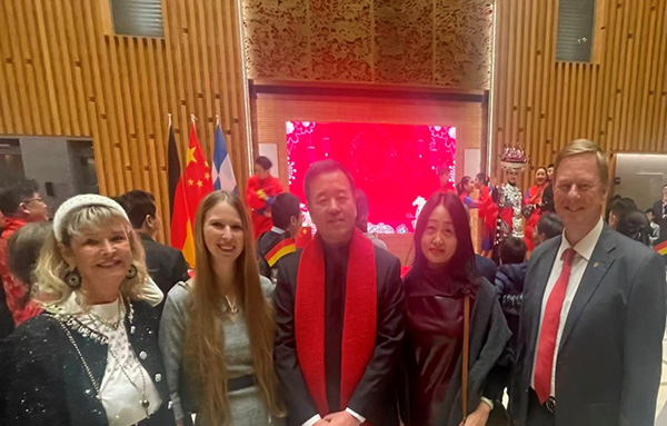2026年2月6日,北京中医药大学德国魁茨汀医院中德双方代表应邀出席中国驻慕尼黑总领馆举办的新春招待会。中国驻慕尼黑总领事邱学军及教育领事刘青文、领桥领事刘山林亲切接待并表示热烈欢迎。魁茨汀中医医院总经理施道丁尔先生与家人深深沉浸于浓厚的中国年氛围之中。施道丁尔女士现场体验中国书法,亲笔书写“福”字,在传统笔墨间感受中华节庆文化的深厚内涵,并向在场嘉宾送上诚挚的新春祝福。
