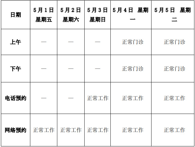 口腔科、皮肤科、推拿科、儿科、中医综合治疗室5月3日至5日全天门诊;