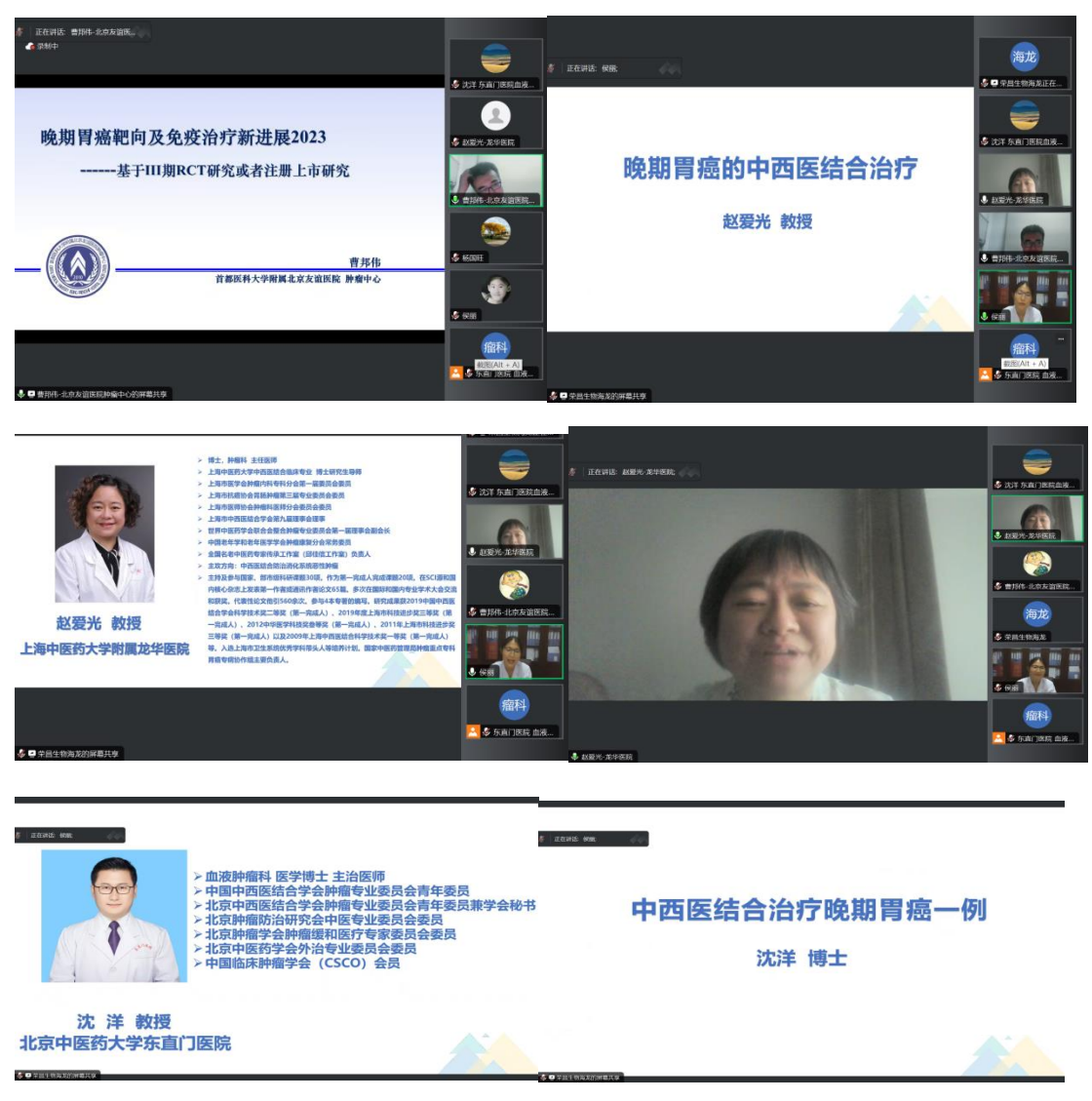 2023 年 7 月 12 日由北京中医药学会肿瘤专业委员会及北京中西医结合 学会肿瘤专业委员会主办,北京中医药大学东直门医院血液肿瘤科承办的消化道 肿瘤中西医诊疗会议在线上举办,北京中医药学会肿瘤专委会杨国旺主委作为大 会主席首先对本次会议进行致辞,侯丽主委作为大会嘉宾主持全程主持会议,大 会特别邀请首都医科大学附属北京友谊医院曹邦伟教授、上海中医药大学附属龙 华医院赵爱光教授给大家分享胃癌国内外临床研究和中西医结合诊疗进展,北京 中医药大学东直门医院沈洋博士分享临床诊治病例,近九十余位同道齐聚线上共 同参与学习。会议全程由北京中医药大学东直门医院血液肿瘤科侯丽主任主持, 曹邦伟教授分享晚期胃癌靶向及免疫治疗新进展;赵爱光教授解读晚期胃癌的中 西医结合治疗进展,并分享团队工作;沈洋博士分享中西医结合治疗晚期胃癌一 例。 大会特别邀请首都医科大学附属北京中医医院富琦教授、首都医科大学附属 北京潞河医院严冬教授、中国中医科学院西苑医院郭中宁教授、北京中医药大学 东直门医院董青教授讨论和分享消化系统肿瘤研究进展及中西医结合诊疗经验。 本次大会以提高晚期胃癌临床水平,促进交流互鉴以及学科发展为目的,是 一场学术交流的盛宴,大家受益匪浅,大会圆满结束。