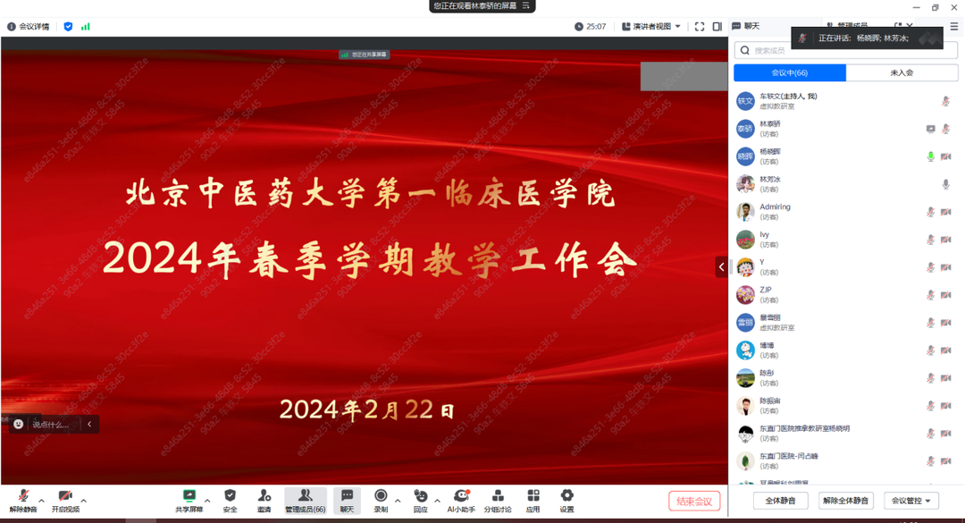 瑞雪迎春,龙年启程。为深入落实立德树人育人目标,我院于2024年2月22日13:00在线上腾讯会议举办了2024学年春季学期教学工作会,旨在开学迎新之际加强教学管理,进一步提高教育教学质量,更好的开展新学期课程。我院教学副院长杨晓晖、教育处处长林燕及各教研室主任、教学秘书、督导组专家、教育处全体教学管理人员共七十余人参加了此次教学工作会。林燕处长担任会议主持。