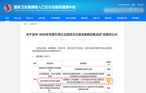 2025年12月10日,国家卫生健康委人口文化发展中心正式公布“2025年党建引领公立医院文化建设案例征集活动”评选结果。北京中医药大学东直门医院的《党旗飘扬,护佑健康——党建引领中医药健康文化“六进”公益行品牌案例》凭借鲜明的中医药特色、创新的服务模式和显著的惠民成效,成功入选全国“创新案例”,成为北京赛区4个全国创新案例之一,为首都公立医院文化建设再添亮色。