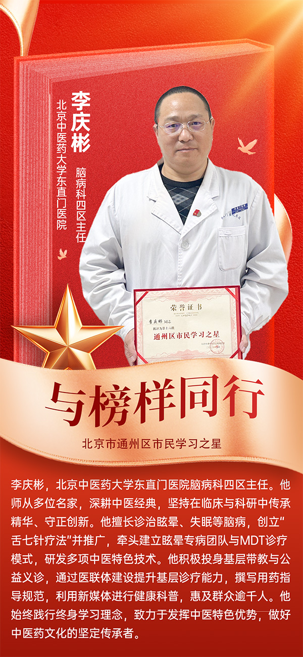 为深入推进学习型城市建设,进一步营造崇尚学习、终身学习的浓厚社会氛围,北京市通州区组织开展了第十六批“市民学习之星”评选工作。北京中医药大学东直门医院李庆彬、吴聪英、田海彤、王文娟、于潇杰、窦洪娜六位同志凭借多年来在专业领域的持续深耕与学习创新,光荣入选。他们以实际行动诠释了医务工作者勤学不辍、锐意进取的职业精神,不仅为医院学习型组织建设注入了鲜活能量,也为北京城市副中心的学习型社会构建贡献了坚实力量。